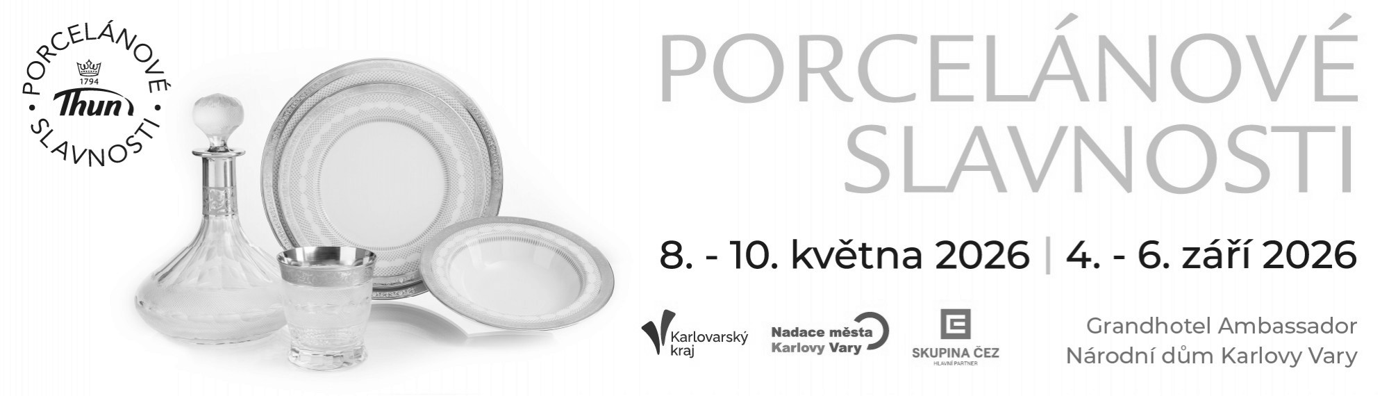 Tradiční Jarní porcelánové slavnosti se konají v termínu 8. – 10. května 2026 v prostorách Grandhotelu Ambassador Národní dům v centru Karlových Varů. Porcelánové slavnosti jsou tradiční oslavou řemeslné zručnosti, elegance a nadčasové krásy porcelánu. Tato výjimečná akce nabízí navštěvníkům výstavu Prostřené stoly či prodej porcelánu a skla za mimořádně zvýhodněné ceny. Přijďte načerpat inspiraci a potěšit smysly.
