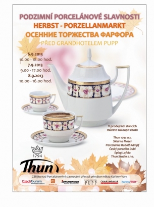 Společnost Thun 1794 a.s. ve spolupráci s Grandhotelem Pupp letos již po osmnácté pořádá Porcelánové slavnosti. Prodejní trhy se uskuteční ve dnech 6. – 8.9.2013 na prostranství před Grandhotelem Pupp. Ve 24 prodejních stáncích bude vedle porcelánu z produkce porcelánky Thun 1794 za mimořádné akční ceny nabízen též sortiment těchto značek: Český porcelán Dubí, Epiag Lofida – závod Chodov, sklářská manufaktura Moser, Porcelánka Rudolf Kämpf, s.r.o..