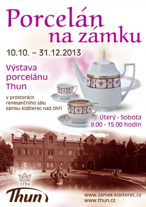 společnost Thun 1794 a.s. pořádá v období 10.10. - 31.12.2013 výstavu porcelánu v prostorách renesančního sálu zámku Klášterec nad Ohří. Jedná se o výstavu současné produkce porcelánky Thun v Klášterci nad Ohří. Expozice bude pro veřejnost otevřena úterý - sobota od 9,00 hod. do 15,00 hod. Srdečně zveme všechny příznivce kvalitního českého porcelánu.