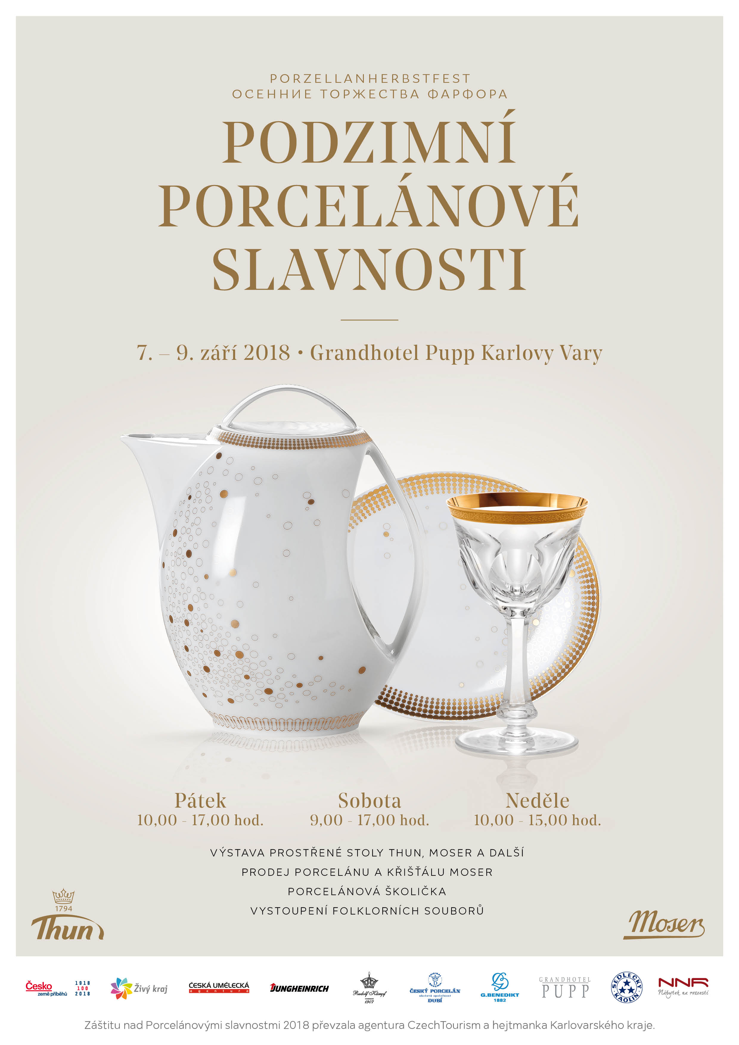 Na prostranství před Grandhotelem Pupp v Karlových Varech se v termínu 7. - 9. září 2018 konají Porcelánové slavnosti, které pořádá porcelánka Thun 1794 a.s. ve spolupráci s Grandhotelem Pupp a sklárnou Moser a.s.. V slavnostním sále Grandhotelu Pupp bude instalována výstava "Prostřené stoly" kde společnost Thun 1794 a.s. prezentuje svoji současnou produkci užitkového porcelánu, kterou na stolech vkusně doplňuje sklo Moser. Výstava je pro návštěvníky slavností přístupná zdarma. V 25 prodejních stáncích je nabízen porcelán regionálních porcelánek (Thun 1794 a.s., Thun Studio, Rudolf Kämpf Loučky, Český porcelán Dubí a Duchcov, Hotelový porcelán G-Benedikt), ale taktéž sklo ze sklárny Moser za mimořádně zvýhodněné ceny. Po celý víkend je pro návštěvníky připraven doprovodný program v podobě živé hudby, bohatého občerstvení a Porcelánové školičky pro děti. Zde si mohou děti vyrobit svůj vlastní hrneček, který bude na místě vypálen a poté si ho děti odnesou domů. V pátek budou po celý den probíhat odborné semináře na porcelánové téma. Záštitu nad akcí převzala agentura CzechTourism a hejtmanka Karlovarského kraje. Porcelánové slavnosti jsou součástí projektu Kulturní září na Sokolovsku 2018.