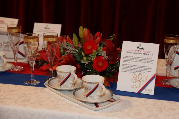 V letošním roce si mj. rovněž připomínáme kulaté výročí a to 100 let založení samostatného československého státu. Při této příležitosti porcelánka Thun 1794 a.s. vyrobila limitovanou porcelánovou edici v nákladu 200 ks. Každá sada je opatřena vlastním číslem a vlastním certifikátem - tím získává na jedinečnosti. Soupravu tvoří šálky s podšálky porcelánového souboru TOM a čtyřhranný podnos. Design, jehož autorem je dlouholetý spolupracovník porcelánky - akademický sochař Jiří Laštovička, je inspirován symboly české státnosti - zlatého dvouocasého lva, zlaté lipové ratolesti doplněné bílo-červeno-modrou trikolorou.