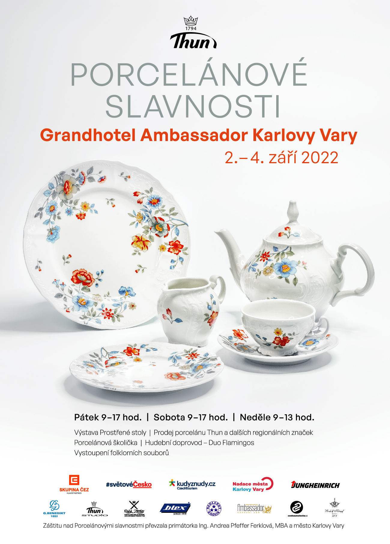 V termínu 2. - 4. září 2022 pro Vás opět chystáme tradiční a oblíbené Podzimní porcelánové slavnosti. Tentokrát přicházíme se zásadní změnou a to v místě konání - blíže k Vám - nově v prostorách známého Grandhotelu Ambassador (bývalý Národní dům) přímo v centru Karlových Varů. Přijďte se podívat na porcelánovou výstavu Prostřené stoly přímo do sálu hotelu Ambassador. V prodejních stáncích v Zeyerově ul. budete opět moci nakoupit český porcelán za výhodné ceny, pro rodiny s dětmi připravujeme skvělou Porcelánovou školičku. Bohaté občerstvení je zajištěno Grandhotelem Ambassador. Během víkendu budou probíhat i vystoupení folklorních souborů v rámci Karlovarského folklorního festivalu. Prostě máte se opět na co těšit. Udělejte si báječný víkend v Karlových Varech, těšíme se na Vaši návštěvu v těchto otevíracích časech: