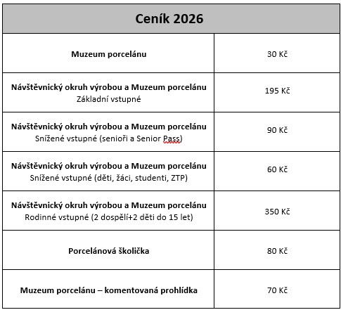 Návštěvnický okruh vede administrativní budovou přes vzorkovnu až přímo do výrobního závodu. Celá trasa je zpestřena filmovou prezentací výroby a prohlídkou finálních výrobků. Turisté si mohou v podnikové prodejně závodu, který patří k největším současné porcelánové výroby ve střední Evropě, výhodně koupit hezký suvenýr. Rodiny s dětmi i školní výpravy pak jistě ocení místní Porcelánovou školičku, kde si nejenom děti, ale i jejich rodiče či prarodiče mohou vlastnoručně ozdobit svůj hrníček, který jim pak jistě bude velmi dlouho připomínat zajímavý výlet.